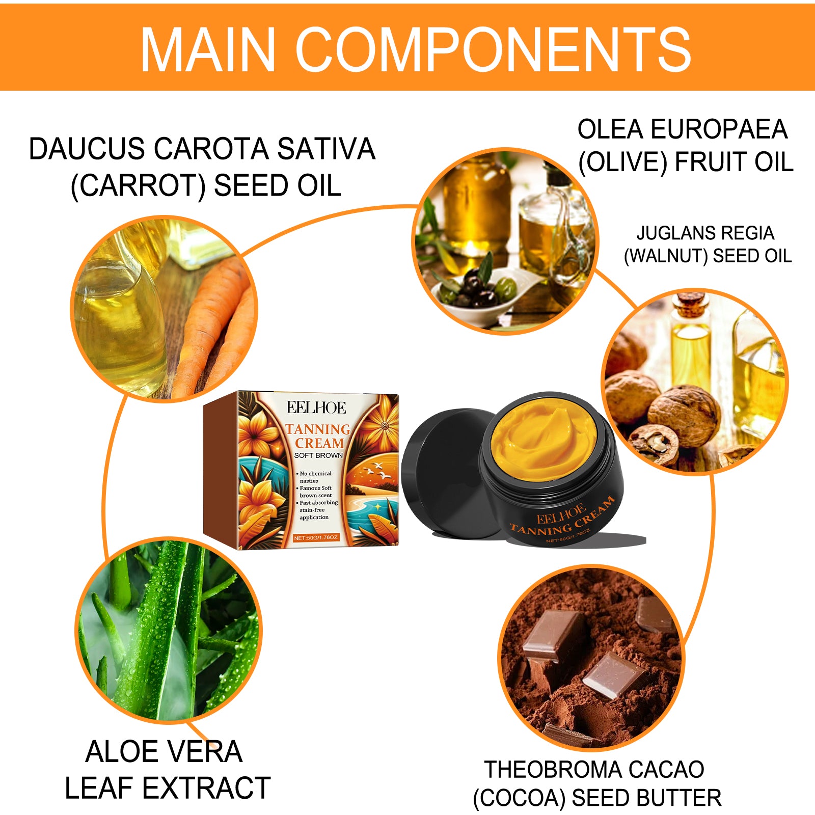 Our Tanning Cream contains Aloe Vera Leaf Extract, Daucus Carota Sativa (Carrot) Seed Oil, Theobroma Cacao (Cocoa)Seed Butter. It accelerates tanning and provides a deep, rich, radiant tan while deeply caring your skin for an even tan. Its use method is very simple: take the appropriate amount of this product evenly apply to the desired body parts. Can help balance skin tone, hide some uneven or light areas that may appear, create a natural summer tan, moisturize and anti-wrinkle, so that you get an even tan.
