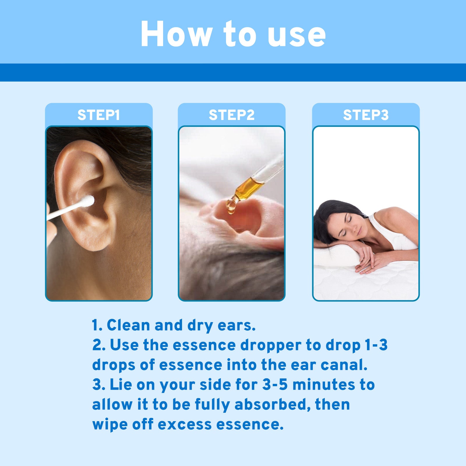 Our tinnitus solution contains Ginkgo biloba extract, licorice extract, garlic extract. It can help you solve ear problems, promote ear health, and reduce the annoyance of hearing problems. The way to use it is very simple: first clean and dry the ear, then use the essence dropper to drop 1-3 drops of essence into the ear canal, lie on your side for 3-5 minutes, let it be fully absorbed, and then wipe off the excess essence. When used, it can help improve hearing clarity, protect ear health, and make you more focused and no longer interrupted by tinnitu。