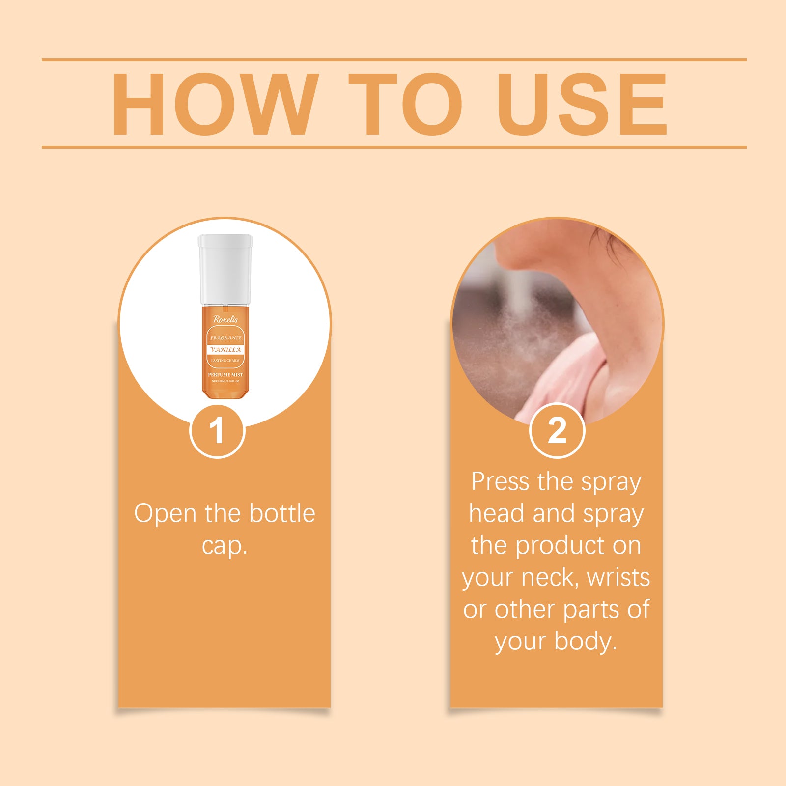 Our vanilla perfume contains glycerin and jasmine extract. It can provide a warm and long-lasting aromatic base, adding depth and complexity to perfumes. How to use it is very simple: 1. Open the bottle cap. 2. Press the sprayer and spray the product on your neck, wrists or other parts of your body. The scent is long-lasting and gives off a charming scent throughout the day. Suitable for all skin types, not easy to cause allergic reactions.